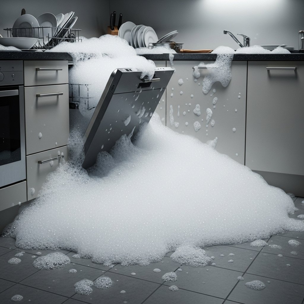 This experience occurs to people only one time in their life. The dishwasher detergent creates minimal suds while dish soap produces excessive bubbles. Using dish soap in the dishwasher will result in your kitchen floor being covered with bubbles .
