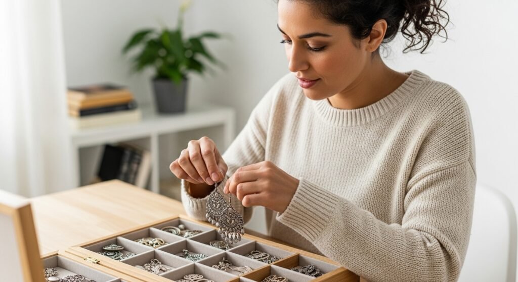 Storing earrings properly maintains their balance. Bent hooks increase uneven weight. Straight storage preserves shape. Balanced earrings sit better and cause less strain when worn.