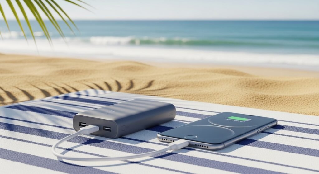 Beach activities which include taking pictures and playing music together with using high screen brightness will cause phone batteries to discharge quickly. The portable charging device which fits in your pocket allows you to maintain connectivity until you require a ride home.