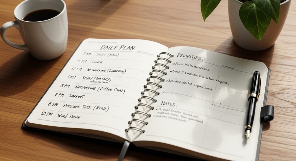 A basic daily schedule allows people to maintain their concentration while achieving their personal objectives. Your learning and networking and personal time activities will become more efficient when you establish specific periods for these activities.