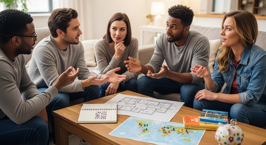 People find it easier to discuss money when they talk about their future plans which include buying a house and traveling and saving money. These talks often focus on planning rather than numbers.